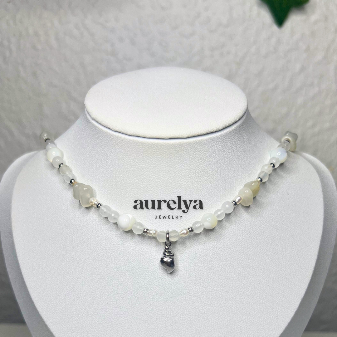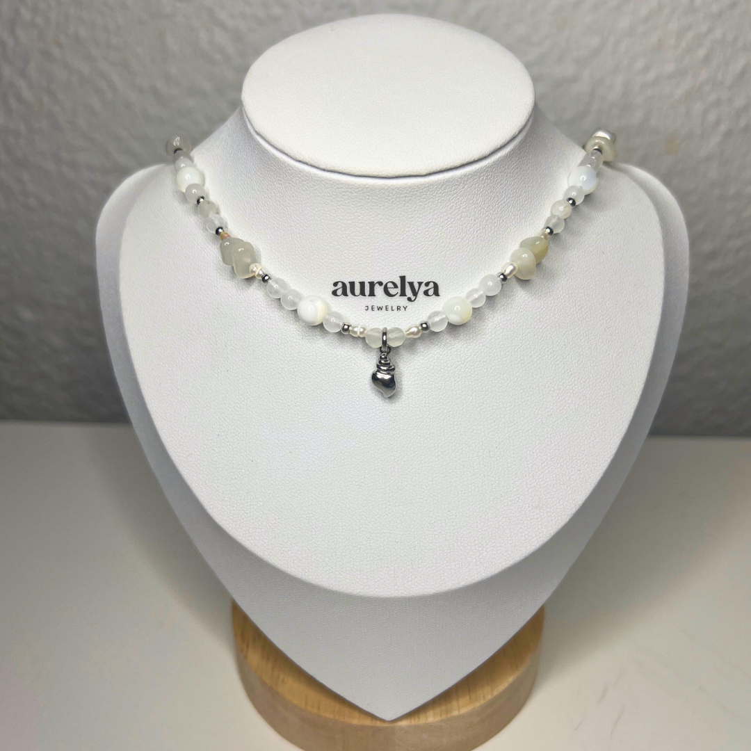 ✦ Material: Mondstein (facettiert, splitter), Perlmutt, Süßwasserperlen, Weiße Jade, Edelstahl